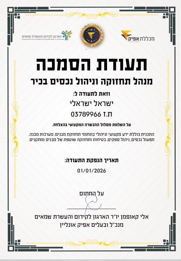 תעודה מוכרת ומקצועית – בסיום הקורס תקבל תעודה של אפיק אונליין, מוסד הכשרה מוביל עם מעל 35,000 בוגרים ו-20 שנות ניסיון. התעודה מאשרת הכשרה מקצועית בתחום ופותחת דלתות מול מעסיקים, חברות ניהול, ובתי משותף. בנוסף, תקבל תעודה מטעם הארגון לקידום והעשרת שמאים בישראל.